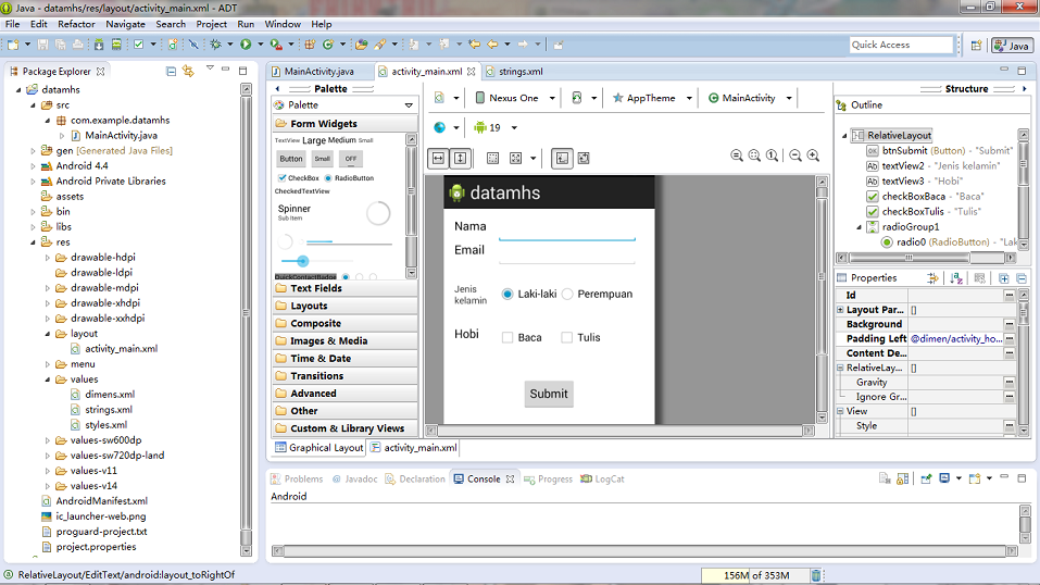kelamin dengan RadioGroup dan 2 item RadioButton, dan Hobi dengan CheckBox,